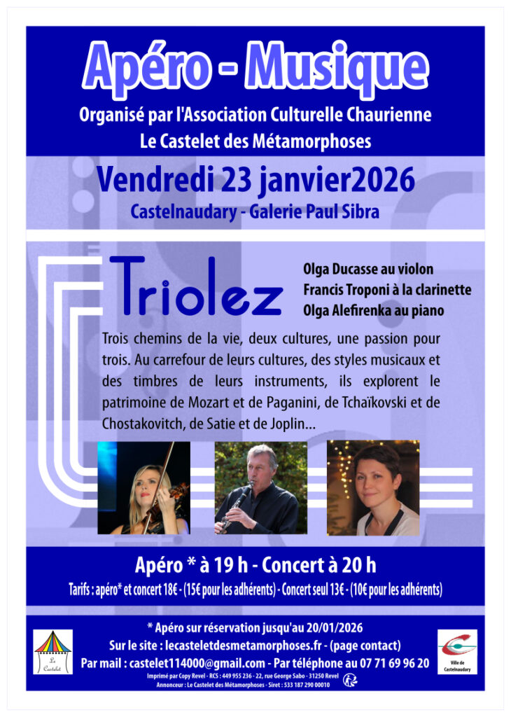 Olga Ducasse (violon), Francis Tropini (clarinette) et Olga Alefirenka (piano): Trois chemins de la vie, deux cultures, une passion pour trois. Au carrefour de leurs cultures, des styles musicaux et des timbres de leurs instruments, ils explorent le patrimoine de Mozart et de Paganini, de Tchaïkovski et de Chostakovitch, de Satie et de Joplin…